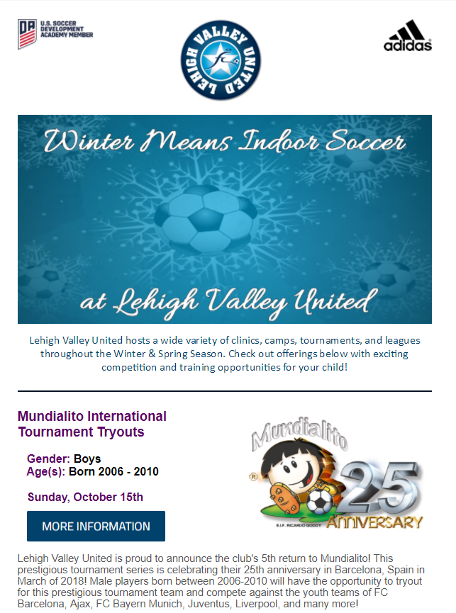 | The LVU Mailing List keeps our players up to date on all of the latest programs, camps, classes, tournaments, and more at Lehigh Valley United, including special offers and discounts! This is the perfect list for players of all ages looking to improve their skills in outside classes, or for teams and coaches looking for elite class competition for their team. |